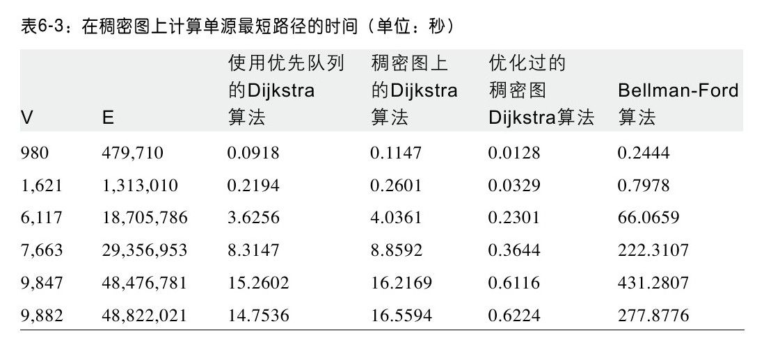 在稠密图中,E大约是O(V2);例如,在一个有着n个顶点的完全图中,存在n(n-1)/2条边。我们不推荐在这样的稠密图上使用Bellman-Ford,因为这样的性能将会退化至O(V3)。表6-3的稠密图是来自于研究人员研究旅行商问题(TSP)[1]时使用的数据。我们进行了100次实验,抛弃最好和最坏的结果,表中的结果是剩余98次的平均值。虽然在优先队列和稠密图版本的Dijkstra算法之间存在一点点差异,但是优化过后的Dijkstra算法的性能得到了非常大的改进,如表中的第5列所示。在最后一列中,我们给出了在同样的问题上,Bellman-Ford算法的性能,但是结果只是五次执行结果的平均值,因为性能退化得太厉害了。从最后一列我们知道,Bellman-Ford算法在小图上的绝对性能看起来还是合理的,但是相比其他算法,在稠密图上使用这个算法就是一个错误。