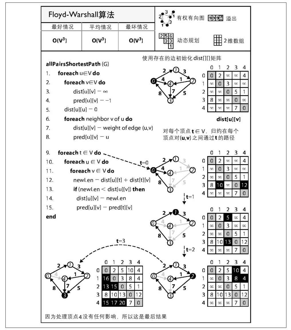 Floyd-Warshall算法得到一个矩阵dist,dist[u][v]的值表示从u到b的最短路径。注意如果dist[u][v]是∞,那么从u到v之间不存在路径。在两个顶点之间的实际路径可以从矩阵pred推导出来,当然,pred也是这个算法计算的结果。