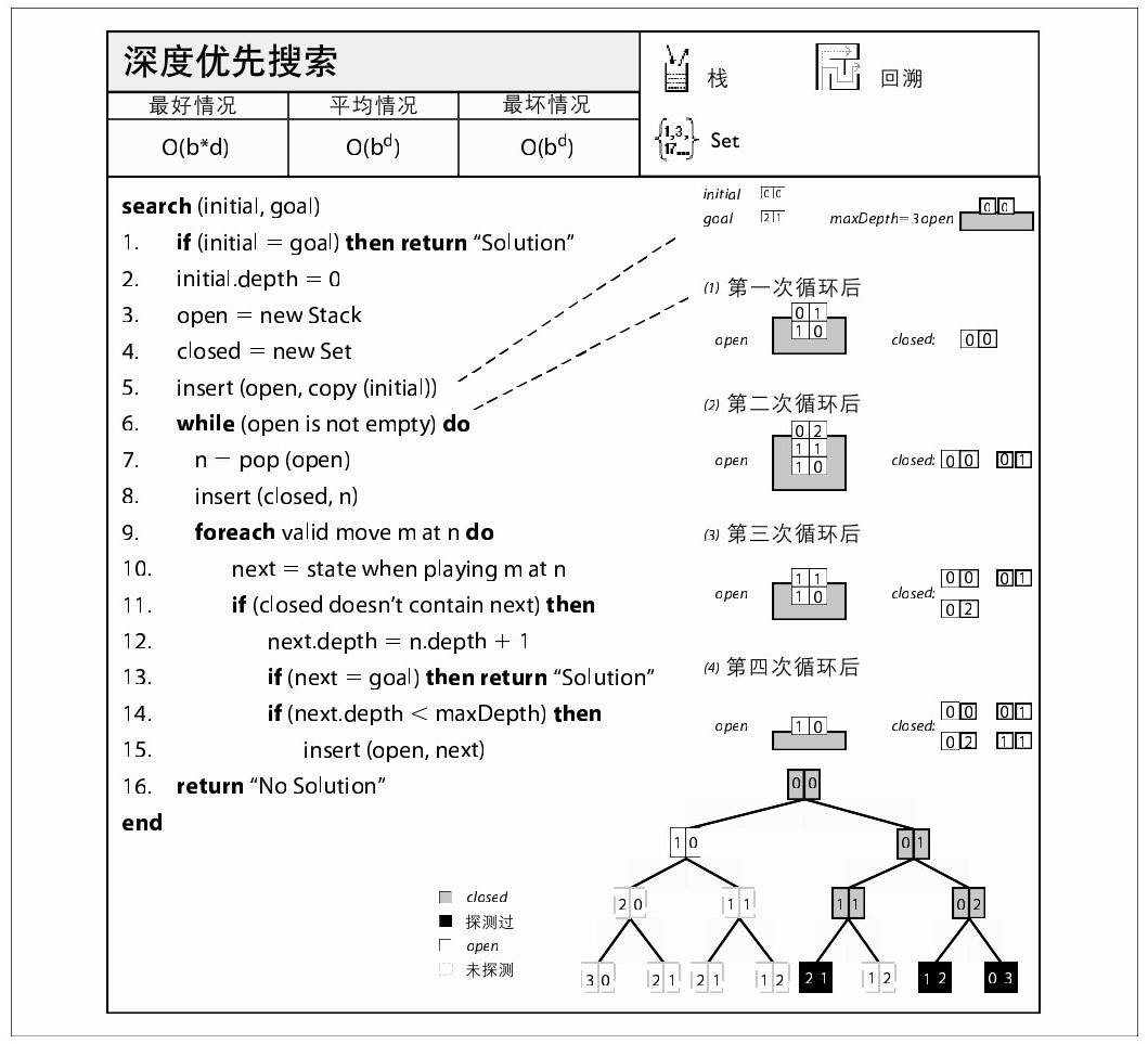 深度优先搜索(图7-5)不断地向前寻找可行状态,试图一次找到通向目标状态的道路,它并不会两次访问同一个状态。因为某些搜索树包含大量的棋面状态,因此深度优先搜索只是在最大搜索深度固定的情况下才具有可行性。深度优先搜索维护一个栈,保存未访问过的棋面状态。在每次迭代时,深度优先搜索从栈中弹出一个未访问的棋面状态,然后从这个棋面状态开始扩展,根据走法计算其后继棋面状态。如果达到了目标棋面状态,搜索终止。如果没有达到的话,任何在闭合集中的后继棋面状态都会被抛弃。剩余的未访问棋面状态被压入栈中,然后继续搜索。