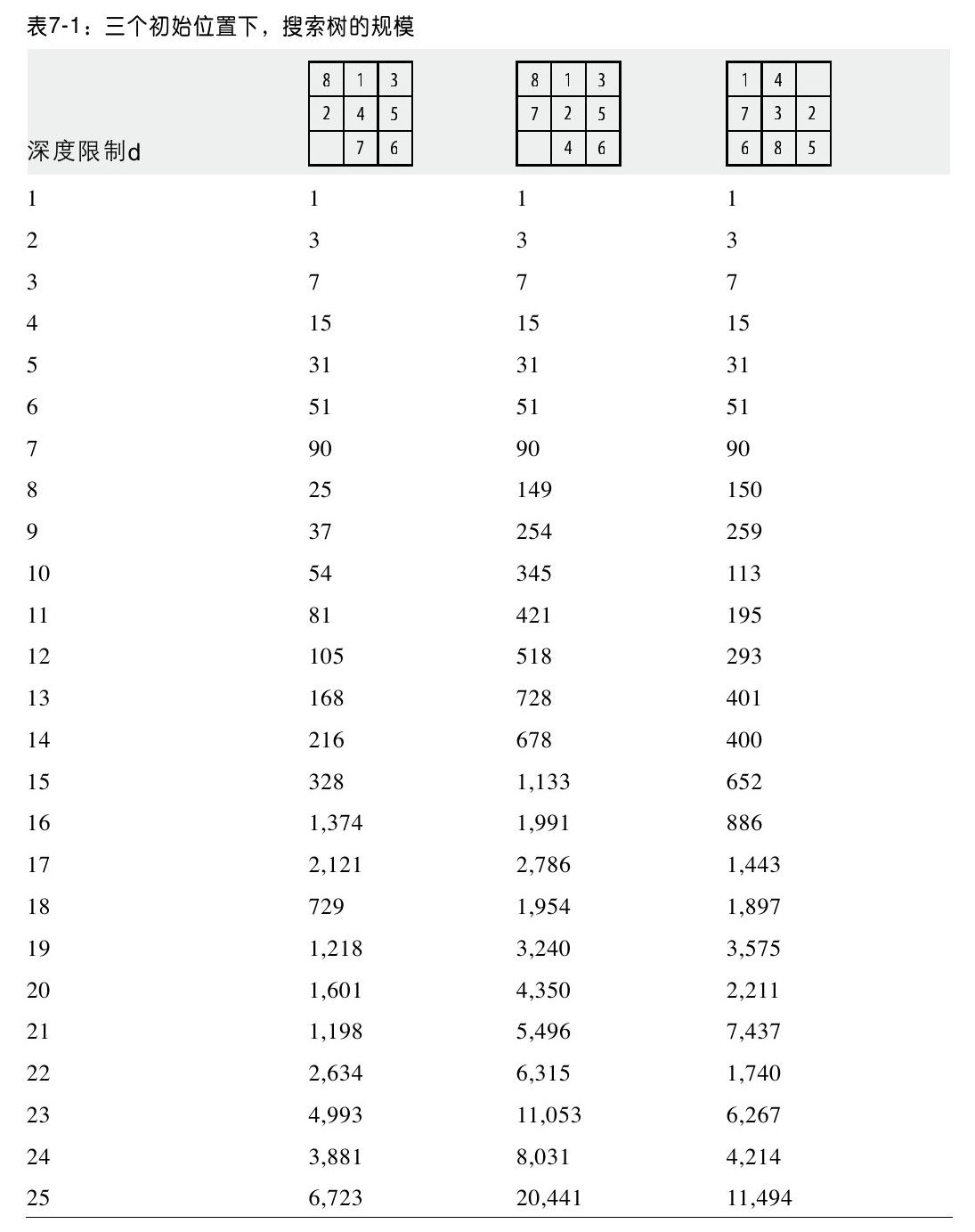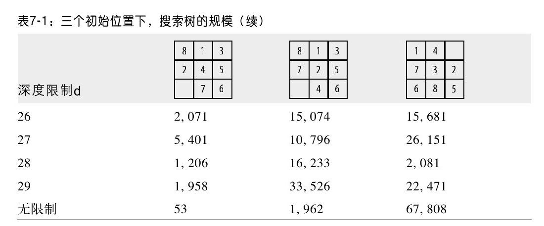 我们使用三个例子来讨论一下深度优先搜索的性能,我们可以看到仅仅是状态的些许不同,搜索却差异甚大。在每个例子中,至多需要走10步才能找到解,表7-1列出了使用可变深度限制的深度优先搜索性能。偶尔深度优先搜索能够很快地找到解,见表7-2,使用固定深度8,算法从棋面状态N1开始,在搜索25个棋面状态之后,找到了一个需要走8步的解(比我们预想的要好两步)。图7-7表示的是随着搜索深度的增长,深度优先搜索的搜索树规模变化情况。一般来说,搜索树的规模是分支因子b的指数级。对于八数码问题来说,根据空格的位置,分支因子在1.6~3.81之间变化(Reinefeld,1993)。三个近似函数表示的是给定搜索深度d,从三个初始位置开始,搜索树的规模。
