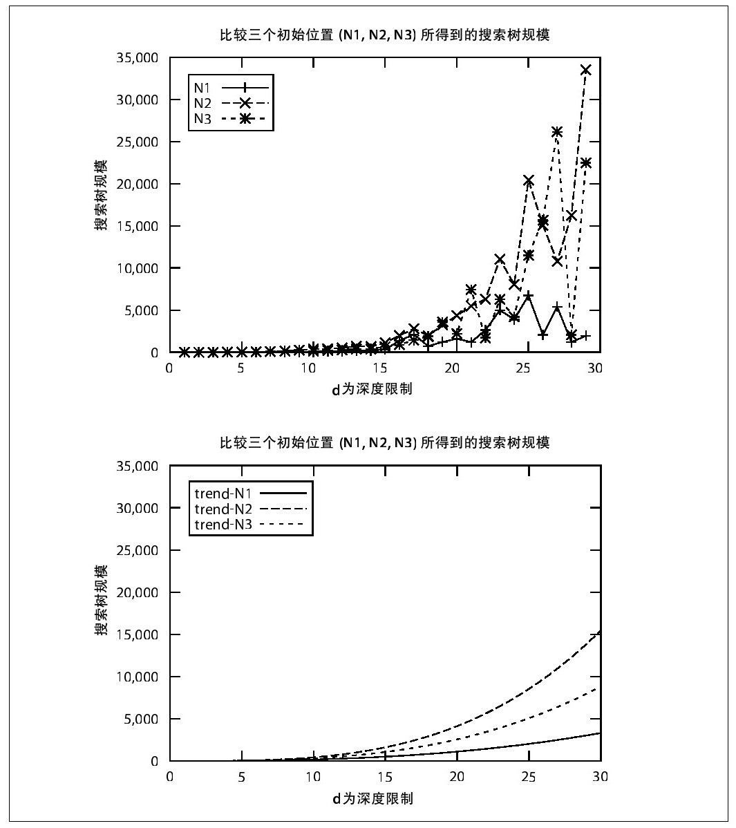 很有意思的是,给定初始状态N1,一个没有限制的深度优先搜索将会在访问30个棋面状态之后找到一个30步的解,这时开放集中仍然有23个棋面状态。但是,这种好事可不会一直发生,我们可以从初始状态N2和N3得到的解中可以看出。