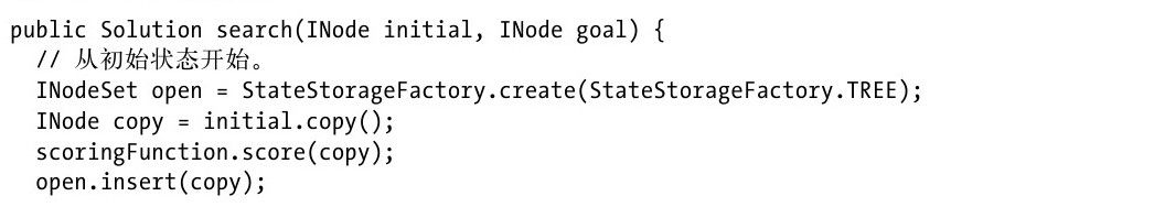 A*搜索在开放集合中存储棋面状态,所以能够高效地删除评价值最小的棋面状态。在深度优先搜索和广度优先搜索中,A*搜索查看是否已经达到目标状态的方式只是有些许不同。我们回忆一下,深度优先搜索和广度优先搜索会检查棋面状态是什么时候生成的。尤其,A*搜索在从开放集合中删除元素时,会检查是否已经达到目标状态,这样做的目的是确保得到的解是最短路径。例7-5是A*搜索的Java实现。