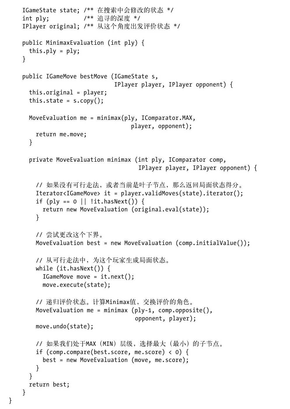 Minimax将会探测一个固定的追寻深度,或者当某个局面状态没有可行走法时放弃继续探测。例7-6的Java代码返回了给定局面状态下,玩家的最好走法。