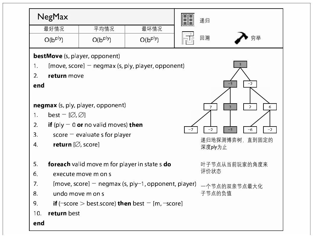 此算法不再将博弈树划分为多个层级,NegMax对走法采取一致的评价策略,从最坏的角度来评价子节点。从本质上来说,玩家走完之后,对手肯定会试着做出最好的决定,因此,算法指导玩家选择最好的走法,限制对手的可行走法。如果你比较图7-15和图7-18的伪代码,你将会看到两个几乎相同的博弈树,唯一的区别就是局面状态是如何被评分的。注意,对玩家来说,两个可行走法中的第一个是最好的,因为这个走法对对手的限制最多。