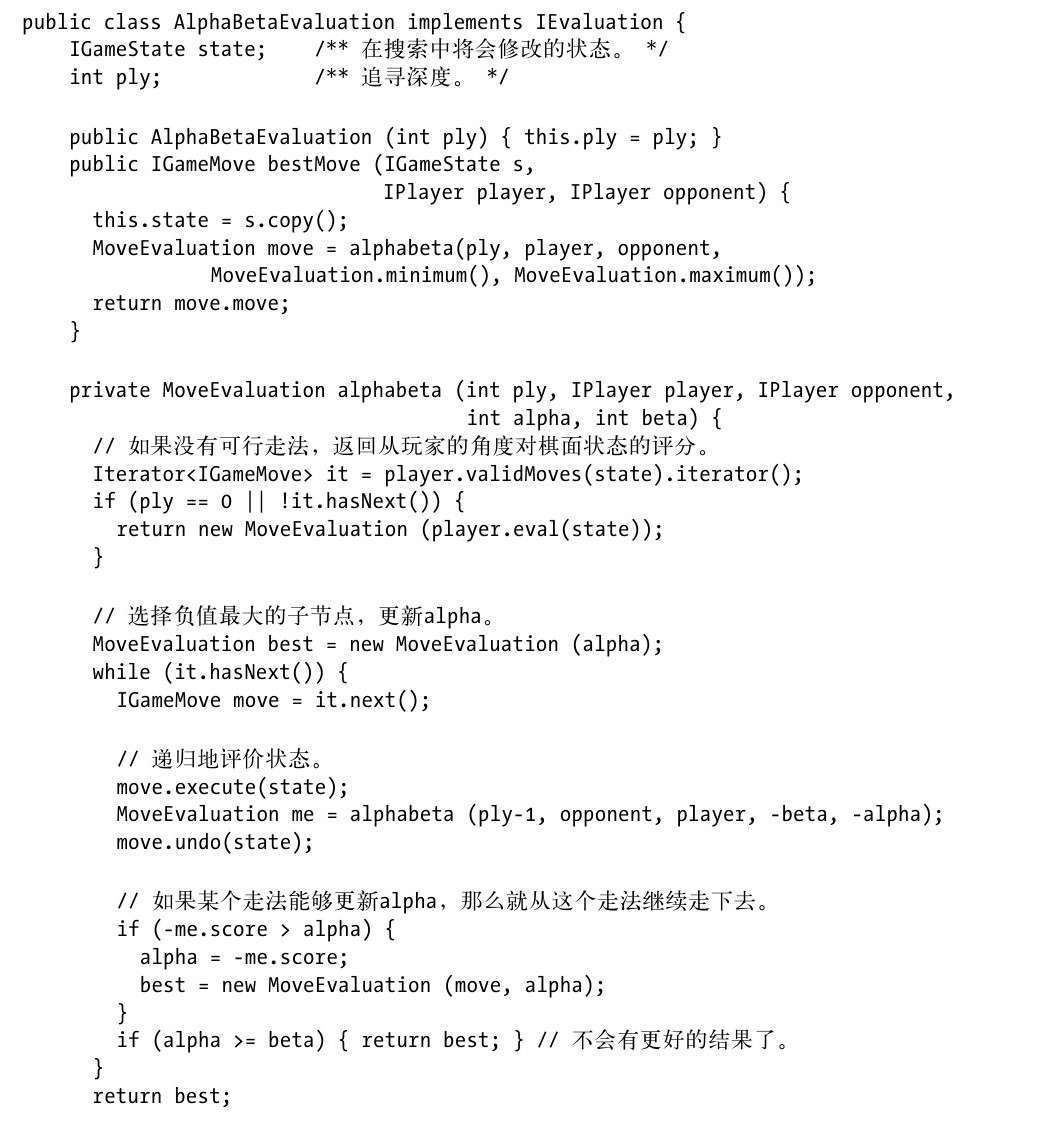 例7-8的AlphaBeta实现基于NegMax扩展。一旦当前局面状态下,玩家不能保证一个更好的位置(α剪枝)或者对手不能强迫玩家走到一个更坏的位置(β剪枝),那么搜索终止。 例7-8:AlphaBeta实现