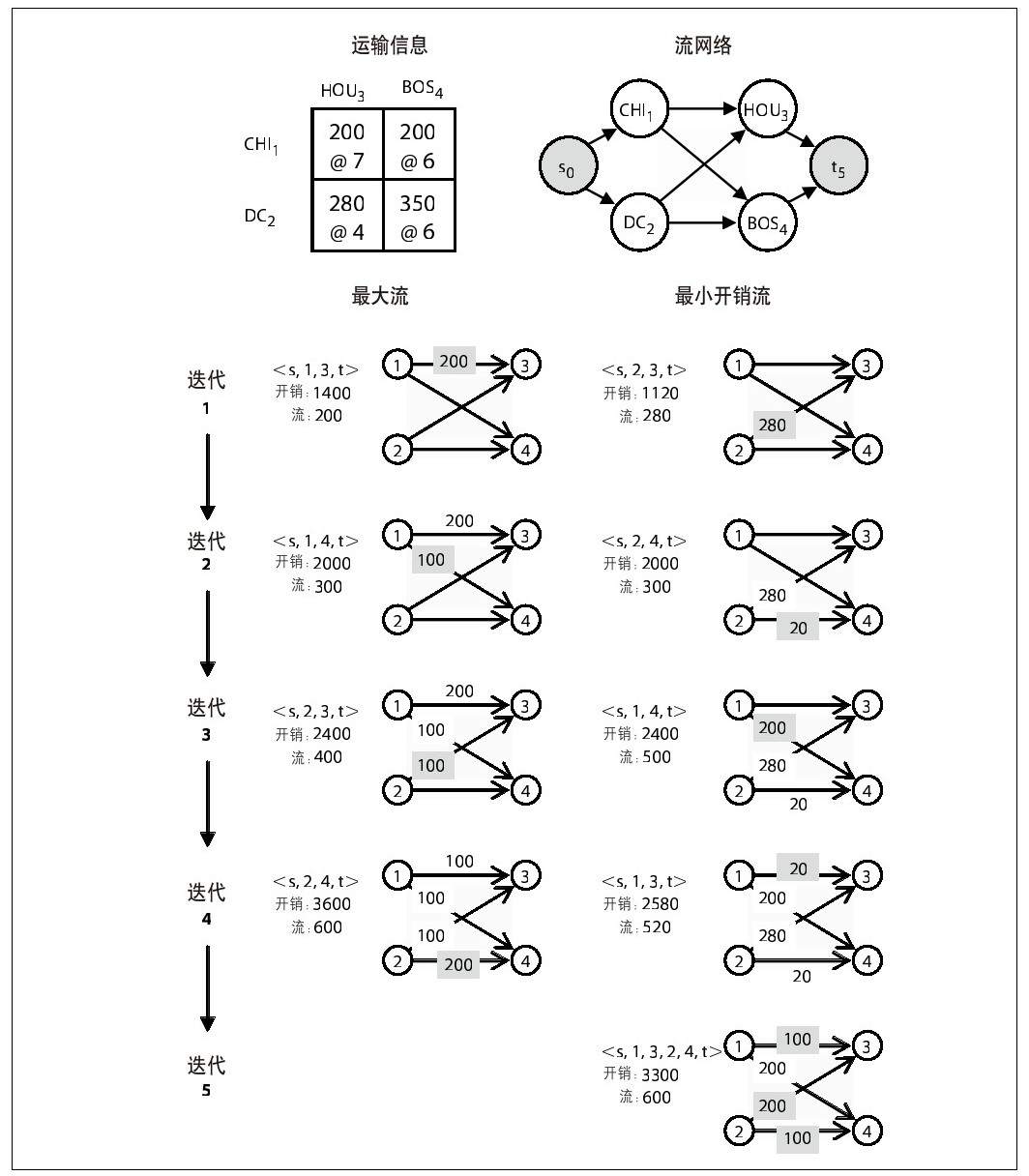 图 8-7 揭示最小开销搜索策略的高效我们不清楚Ford-Fulkerson算法是否可以用来解决这个问题,但是我们能够构造一个图G,有一个源点s0,连接两个工厂顶点(v1和v2)以及有一个新的汇点t5,连接两个消费顶点(v3和v4)。在图8-7的左边我们使用Edmonds-Karp来证明我们能够满足消费者的所有需求,但是每天的运输费用是3600美元。为了节省空间,源点和汇点都被忽略了。在Ford-Fulkerson的每次迭代中,增广路的影响(当一次迭代更新了边的流,流的值标记为灰色)显而易见。
