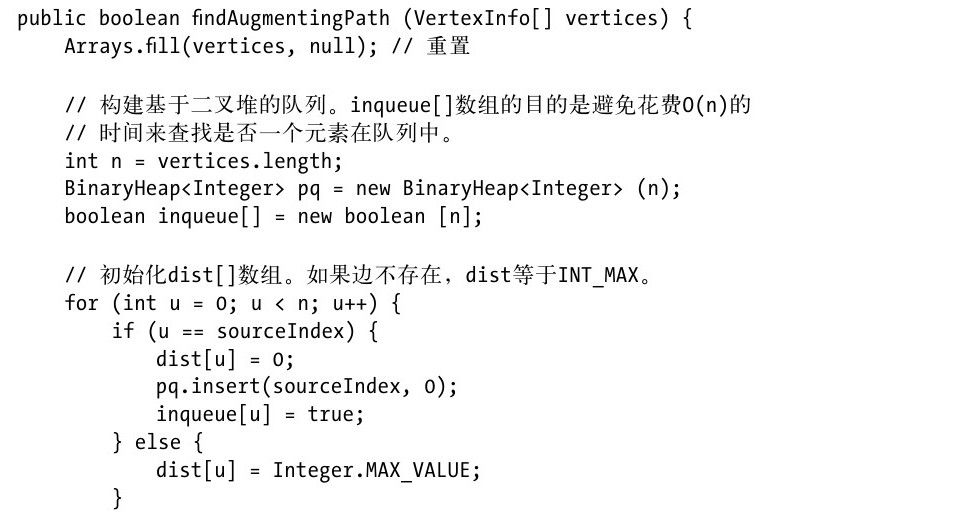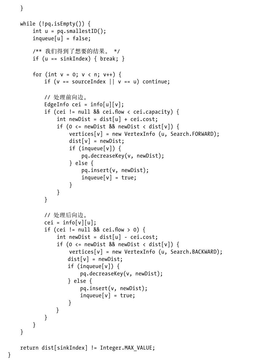 为了寻找最小开销的增广路,我们就不能拘泥于单纯使用广度优先搜索或者是深度优先搜索。正如我们在Prim算法中所看到的那样,我们必须要使用一个优先队列来存储和计算流网络中,每个顶点到源点的距离。我们会计算从源点到每一个顶点运输一个单位的开销,然后我们需要在不断的计算过程中维护一个优先队列。随着搜索的进行,优先队列存储着节点的有序集合,这个集合中的元素将会指导着搜索进行的方向。从优先队列中取出到源点距离(这里是开销)最小的顶点u,然后选择一个还未被访问的邻接顶点v,并且满足(a)前向边(u,v)还有多余的容量可供扩展,或者(b)后向边(v,u)的流可以减少,继续进行搜索。如果我们在搜索的过程中遇到了汇点,那么搜索就可以终止,而且成功地找到一条增广路,否则,不存在这样的增广路。例8-6是ShortestPathArray的Java实现。