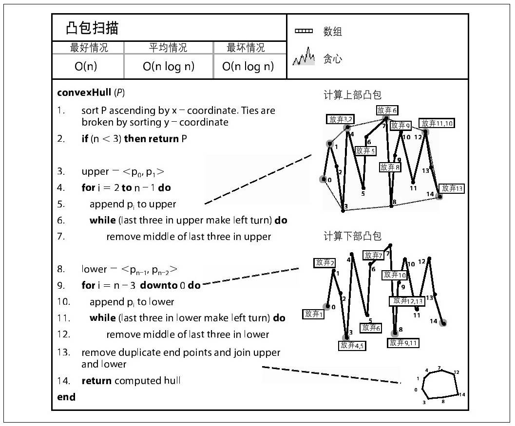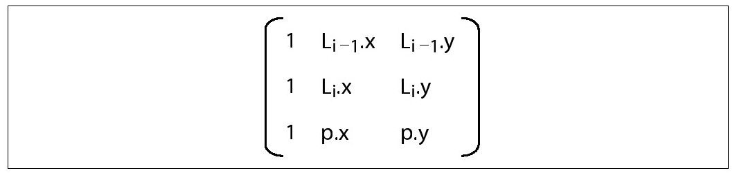 如果三个点Li-1、Li和p组成的两条线段形成了一个右折,那么凸包扫描算法将会把这个点p加入到这个凸包中。这里计算了一个叉积cp=(Li.x-Li-1.x)(p.y-Li-1.y)-(Li.y-Li-1.y)(p.x-Li-1.x),等价于计算图9-9中的3×3的矩阵。如果cp<0,那么这三个点组成的线段形成了一个右拐,凸包扫描算法继续进行。如果cp=0(也就是说三点共线)或者cp>0(三点组成的线段形成了一个左拐),那么中间的点Li将会从凸包中删除,这是为了维护凸多边形的性质。凸包扫描算法计算出上部凸包之后,按照类似的方法计算出下部凸包(递减x来选择点),最后将这两个凸包合并在一起。