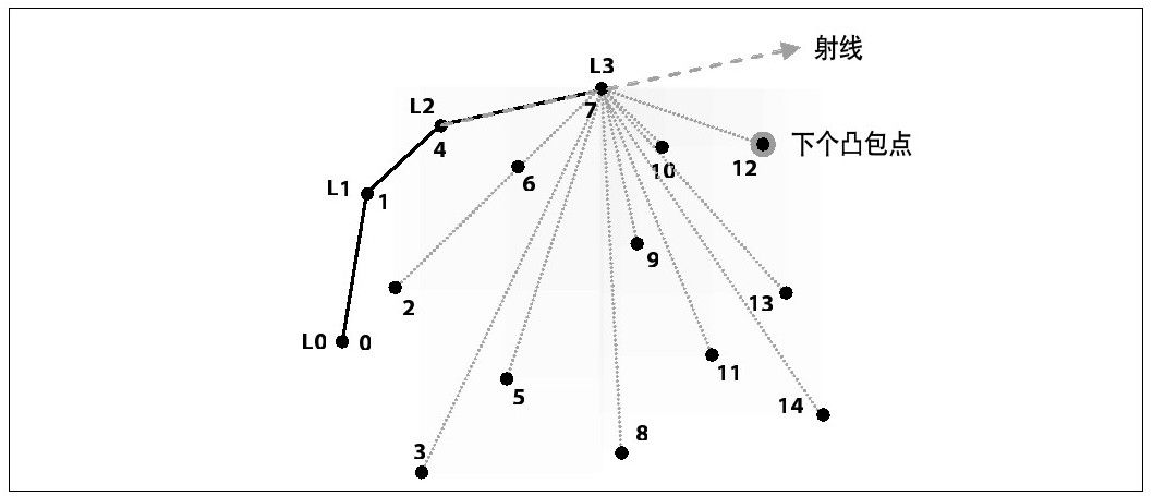 图 9-8 凸包的增量式构建Andrew凸包扫描算法将整个问题分成两个部分,分别构建一个上部凸包和一个下部凸包。首先,点集P中所有的点按照x坐标排序(x坐标相同时,对y坐标进行排序)。图9-8中的点已经按照x坐标从左至右标上了数字。上部凸包从P中的最左边两个点开始构建。凸包扫描算法首先对上部凸包进行扩展,在P中找到这样一个点p,排序后,其前一个位置即上部凸包的最后一个点Li。