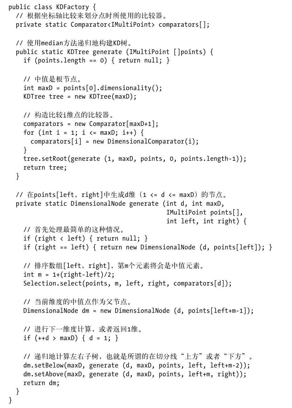 二叉查找树仍然是一个高效的查找结构,它也能够在节点插入和删除时做出平衡调整。但不幸的是,kd树的平衡调整就不这么容易了,因为有些深层次的结构信息和所表示的平面区域相关。最理想的解决方案是构建一棵kd树,使得a叶子节点都是在同一层,或者b所有的叶子节点在其他叶子节点一级。例9-4使用递归来迭代维度的每个坐标。它从点集中选择中位元素,然后将在这个元素“下方”的元素插入左子树,“上方”的元素插入右子树。这段代码适用于任何维度。