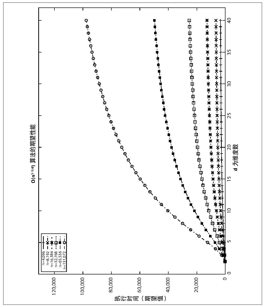 图 9-25 O(n1-1/d)算法的期望性能我们很难生成测试范围查询算法性能的数据。我们只能通过和穷举算法进行比较来证明此算法的效率。下面这些情况下,我们使用n个d维点作为输入来进行比较。这些点的坐标值区间是[0,4096]。
