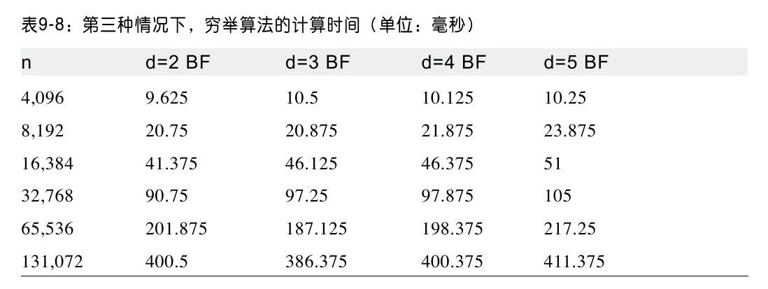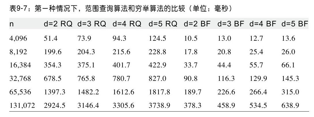 我们构建了一个包含kd树中所有点的查询区域。这个例子告诉我们的区间查询算法能够提供的最大性能改进,这种情况下,其性能和kd树的维度d无关。我们会执行大约5~7次实验,然后能看到kd树相关的操作所需要的开销。在表9-7中,穷举算法的开销随着维度d的增加而增大,因为计算d维点之间距离的操作是O(d)而不是常数。穷举算法在高维度上性能轻易地超过了基于kd树的最邻近点算法。