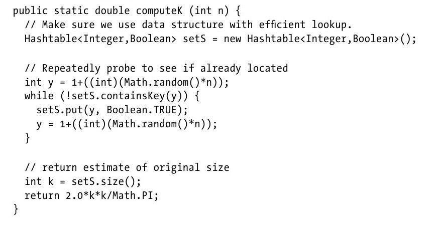下面举个例子来说明如何利用概率算法获得计算速度的提升,假设我们要估算一个包含n个元素的集合:{x1,……,xn}的大小,也就是n的值。最直接的方法就是对所有元素进行计数。但是如果不太准确的结果也可以接受,而同时希望计算速度更快一些的话,那么下面例10-1中描述的算法会是一个更好的选择。