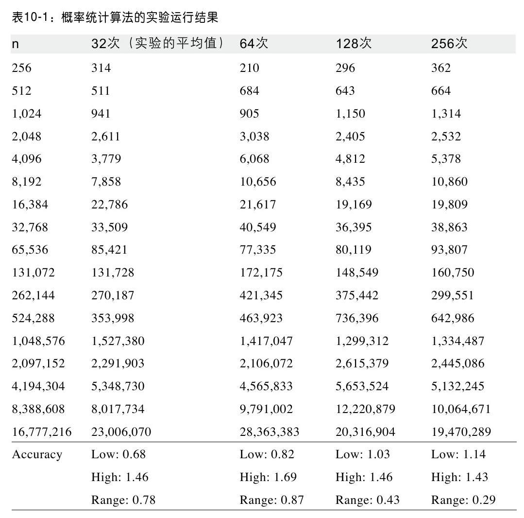 表10-1给出了该算法在大量独立实验组中得到的结果。概率算法产生了n的估算值的t次实验结果(t分别为32、64、128、256)。在这些实验中,最大和最小的估算结果都已去掉,每列所示的是剩下t-2次实验结果的平均值。最后三行通过计算估算值/实际值的最小比率a、最大比率b以及两者之间的差值给出了“估算平均值”的准确率。例如,32次实验中,估算值353 998相对其目标值524 288的比率最低(0.68),而1 527 380相对1 048 576的比率则最高(1.46)。