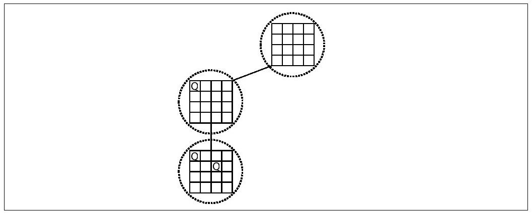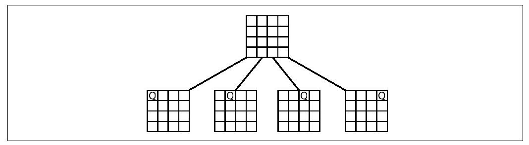 Donald Knuth(1975)提出了另一种全新的方法来估算搜索树的形状和大小。它的方法会随机地向下遍历搜索树。为了简洁起见,我们将会用4皇后来说明这个方法,明显地,它可以轻易地应用于估算19皇后问题的解的数量。从搜索树的根开始(没放置任何皇后),我们估计出在第0层有1个节点。接下来,我们会在所有节点上去确定其儿子节点的数量(由该节点所对应的中间解的直接扩展的数量),并且随机地选择它们。我们看到根节点有四个孩子,因此我们(正确地)估计在第1层有4个节点。接下来,我们随机地选择四个中的一个节点,比如说第一个,如图10-4所示。