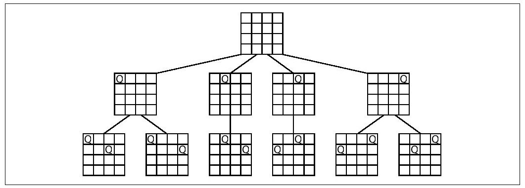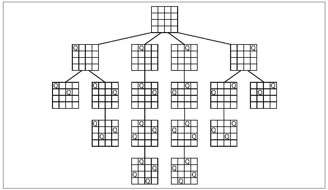 为了求出4皇后问题的精确解,我们基于每行只能有一个皇后的事实,生成了一棵搜索树。起始状态是没有放置任何皇后,图10-1展示了如何通过在第一行上依次摆下4个皇后来对搜索树进行直接扩展。