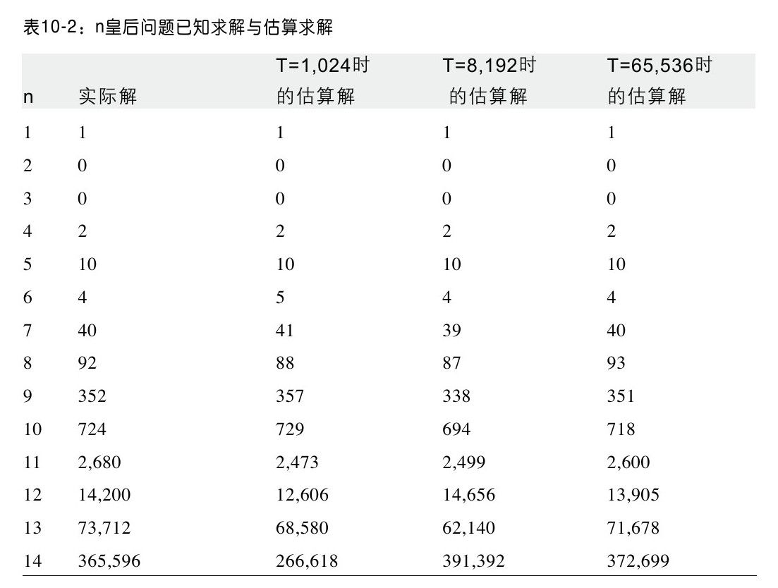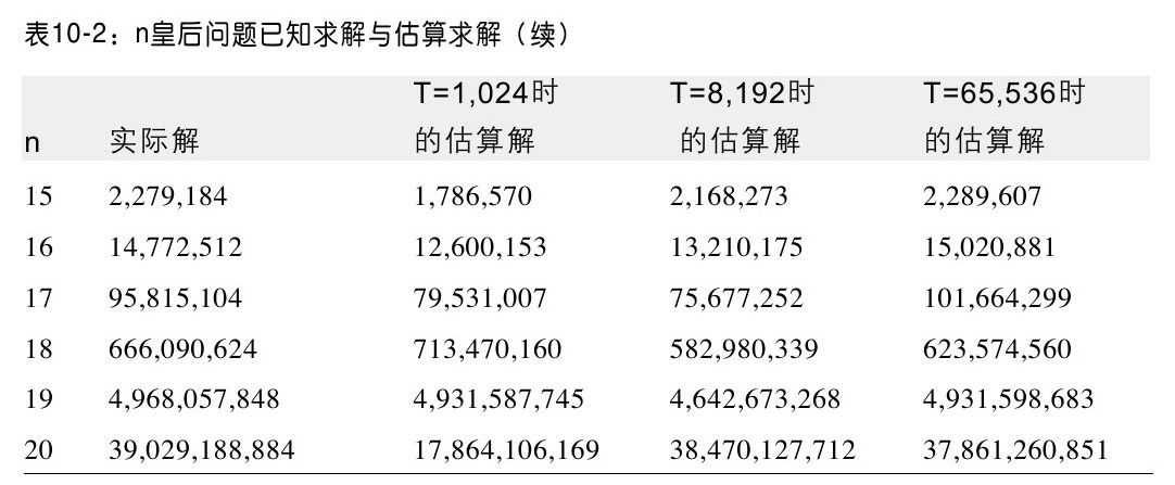 目前没有已知的技术可以高效地求解n皇后问题。表10-2所包含的数据是早些时候Sloane的整数序列在线百科全书所计算的[1]。