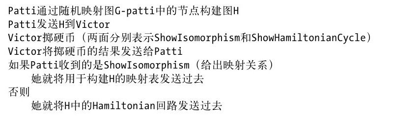 图 10-6 同构图示例对于大型实例来说这两个问题都不太可能找到有效的解决方法。我们利用了这些问题的难度开发了一种适合在不安全信道上的确认协议,同时保证Albert无法伪装成Patti。在开始确认前,Patti先建一张存在Hamiltonian回路的大图,具体可以这样来做:先从一条回路开始,而这条回路会通过每一个节点,然后再不断地加边,直到对于其他人来说很难找出这个Hamiltonian回路的程度。然后Patti就可以在她名下的一个公开目录公布这个图Gpatti。Victor和Albert都可以读取这张图,但只有Patti能够找出图Gpatti中的Hamiltonian回路。