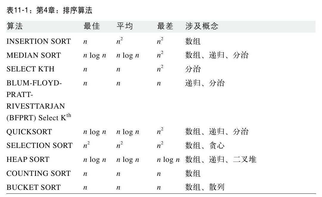 如果你需要对数据排序,没有“一刀切”的方法可以总能获得最好的性能。表11-1汇总了第4章谈到的排序算法的结论。你是要对一个整数集合进行排序,而这些整数的范围是有限的吗?那么最快的算法莫过于计数排序了,尽管它比其他算法需要更多的存储空间。你需要对已经几乎有序的复杂数据进行排序吗?那么插入排序将更适合。你需要关心那些相等元素的相对位置?那么你需要稳定排序算法。你确定数据提取自均匀分布吗?那么你一定要试试桶排序,因为它能够利用这个特性来获得额外的性能提升。如果你对这些都十分了解,那么就能够通过数据来选择最合适的算法。