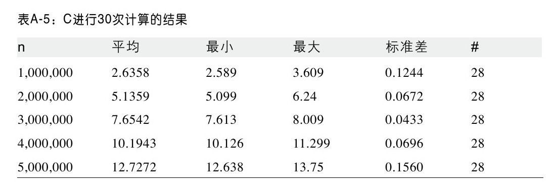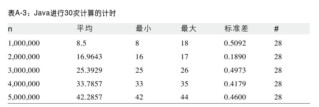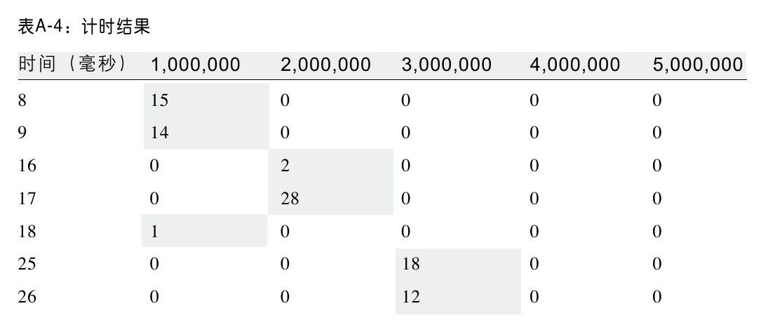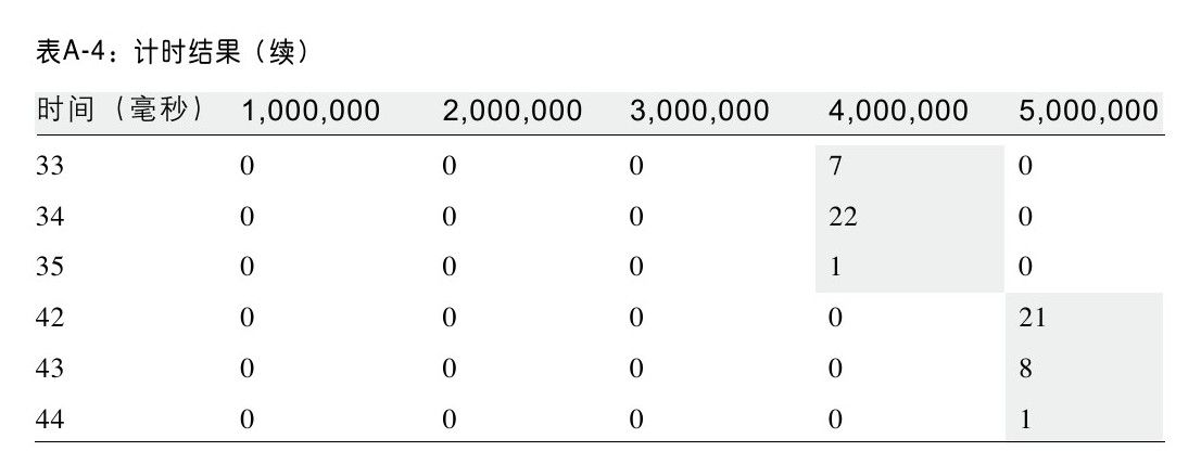 审视在相同的平台上(这里是Linux 2.6.9-67.0.1.ELsmp i686,机器是高端计算机和桌面PC)的实际结果是非常有帮助的。我们列出3个表(表A-3、表A-5、表A-6),分别是Java、C和Scheme的结果。在每张表中,时间的单位都是毫秒,并且给Java的结果描绘一张直方图。