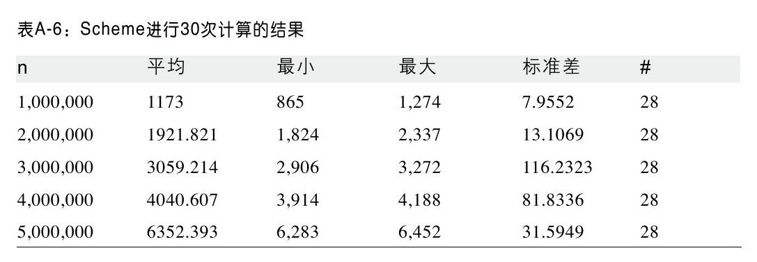 最后一张表是Scheme的结果。其结果的变化程度比Java和C更高。一个可能的原因是递归解需要更多的簿记计算。