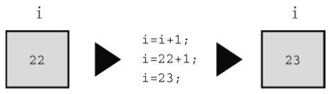 对数学而言,这完全行不通。如果给一个有限的数加上 1,它不可能“等于”原来的数。但是,在计算机赋值表达式语句中,这很合理。该语句的意思是:找出变量 i 的值,把该值加 1,然后把新值赋值变量i(见图5.1)。