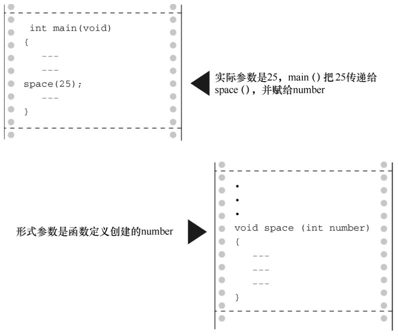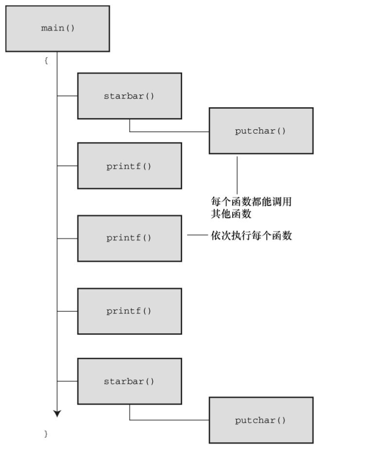 如果把starbar看作是一个黑盒,那么它的行为是打印一行星号。不用给该函数提供任何输入,因为调用它不需要其他信息。而且,它没有返回值,所以也不给 main提供(或返回)任何信息。简而言之,starbar不需要与主调函数通信。