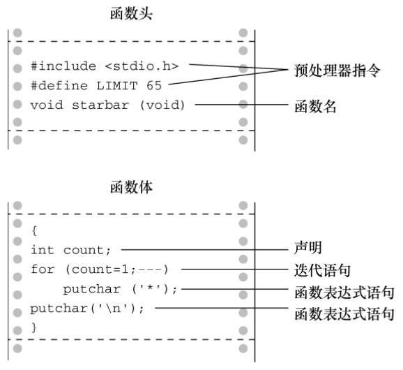 程序中strarbar和main的定义形式相同。首先函数头包括函数类型、函数名和圆括号,接着是左花括号、变量声明、函数表达式语句,最后以右花括号结束(见图9.2)。注意,函数头中的starbar后面没有分号,告诉编译器这是定义starbar,而不是调用函数或声明函数原型。