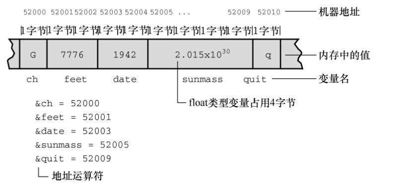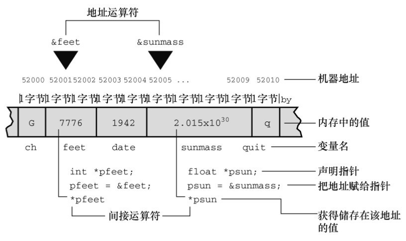 在许多语言中,地址都归计算机管,对程序员隐藏。然而在 C 中,可以通过&运算符访问地址,通过*运算符获得地址上的值。例如,&barn表示变量barn的地址,使用函数名即可获得变量的数值。例如,printf("%d\n", barn)打印barn的值,使用*运算符即可获得储存在地址上的值。如果pbarn= &barn;,那么*pbarn表示的是储存在&barn地址上的值。