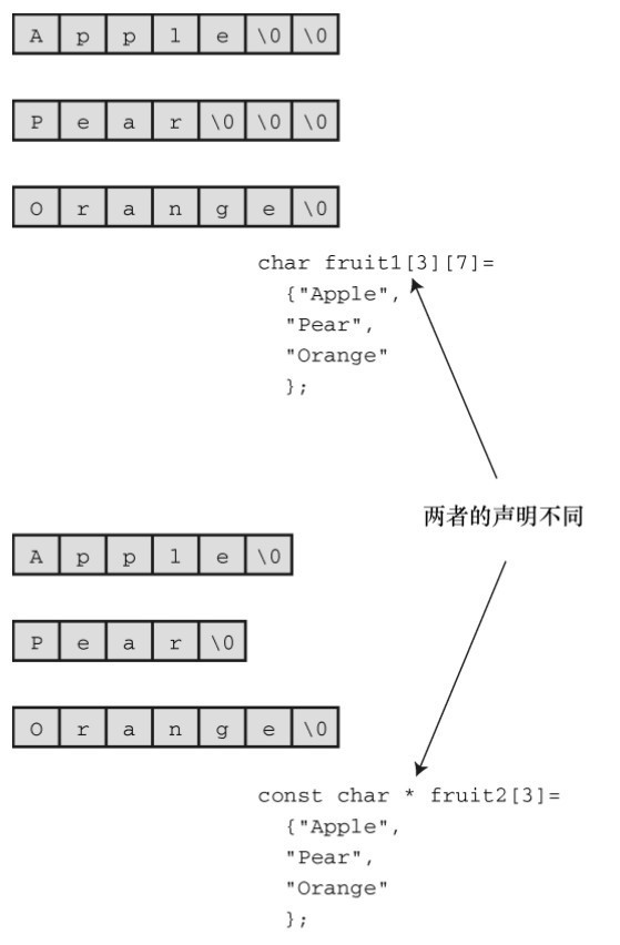 字符串字面量被视为const数据。由于pt1指向这个const数据,所以应该把pt1声明为指向const数据的指针。这意味着不能用pt1改变它所指向的数据,但是仍然可以改变pt1的值(即,pt1指向的位置)。如果把一个字符串字面量拷贝给一个数组,就可以随意改变数据,除非把数组声明为const。