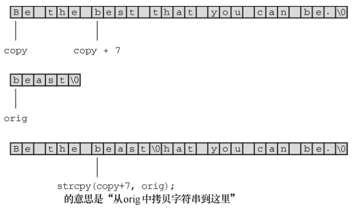 注意,strcpy把源字符串中的空字符也拷贝在内。在该例中,空字符覆盖了copy数组中that的第1个t(见图11.5)。注意,由于第1个参数是copy + 7,所以ps指向copy中的第8个元素(下标为7)。因此puts(ps)从该处开始打印字符串。