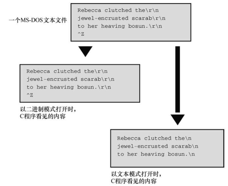 为了规范文本文件的处理,C 提供两种访问文件的途径:二进制模式和文本模式。在二进制模式中,程序可以访问文件的每个字节。而在文本模式中,程序所见的内容和文件的实际内容不同。程序以文本模式读取文件时,把本地环境表示的行末尾或文件结尾映射为C模式。例如,C程序在旧式Macintosh中以文本模式读取文件时,把文件中的\r转换成\n;以文本模式写入文件时,把\n转换成\r。或者,C文本模式程序在MS-DOS平台读取文件时,把\r\n转换成\n;写入文件时,把\n转换成\r\n。在其他环境中编写的文本模式程序也会做类似的转换。