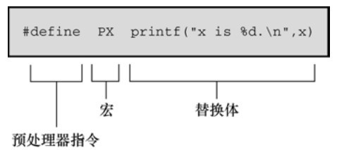 这里同样进行了替换。这是一个新用法,到目前为止我们只是用宏来表示明示常量。从该例中可以看出,宏可以表示任何字符串,甚至可以表示整个 C 表达式。但是要注意,虽然 PX 是一个字符串常量,它只打印一个名为x的变量。