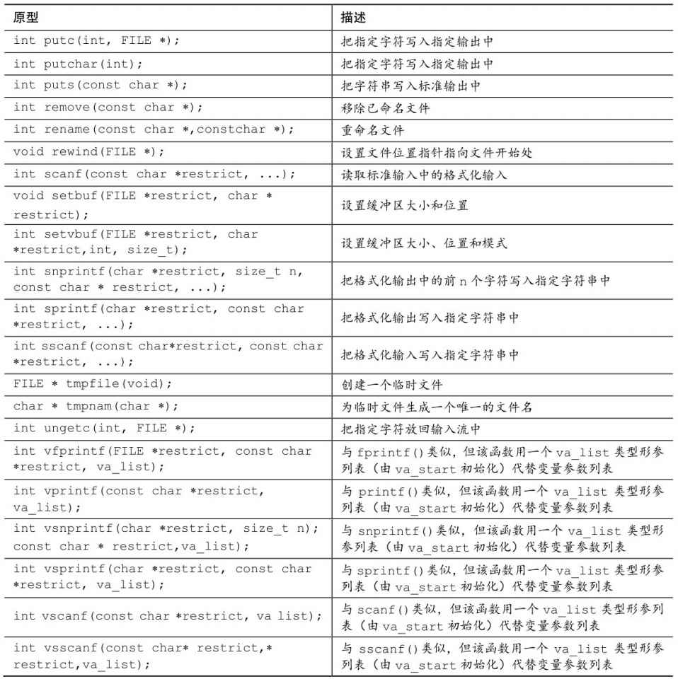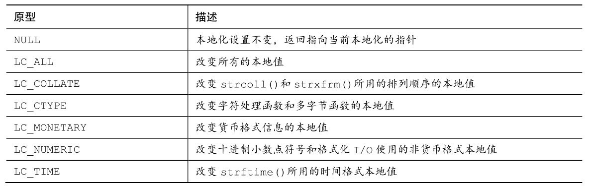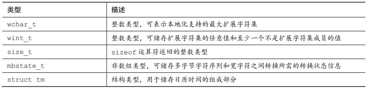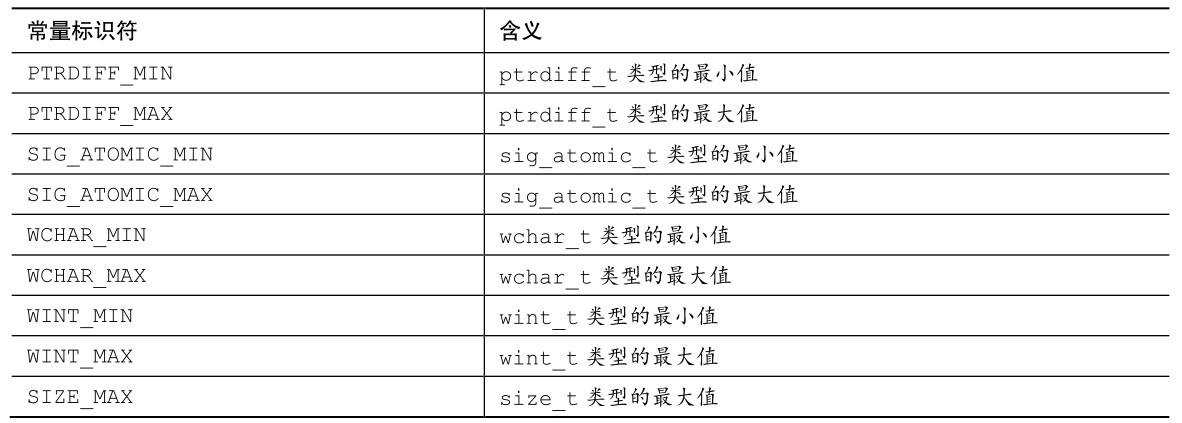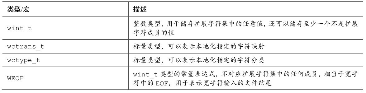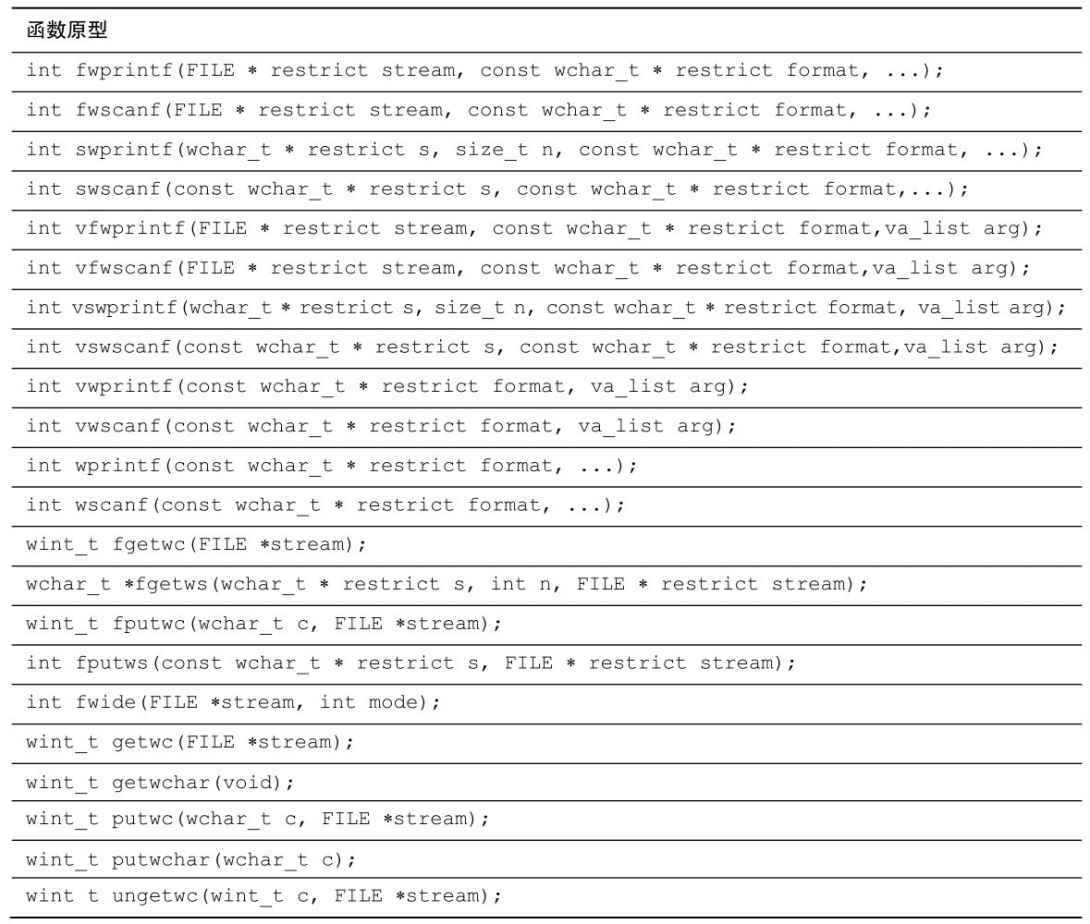 类似地,还有getwchar、putwchar、fgetws和fputws函数。wchar_t头文件定义了一个WEOF宏,与EOF在面向字节的I/O中起的作用相同。该宏要求其值是一个与任何有效字符都不对应的值。因为wchar_t类型的值都有可能是有效字符,所以wchar_t库定义了一个wint_t类型,包含了所有wchar_t类型的值和WEOF的值。