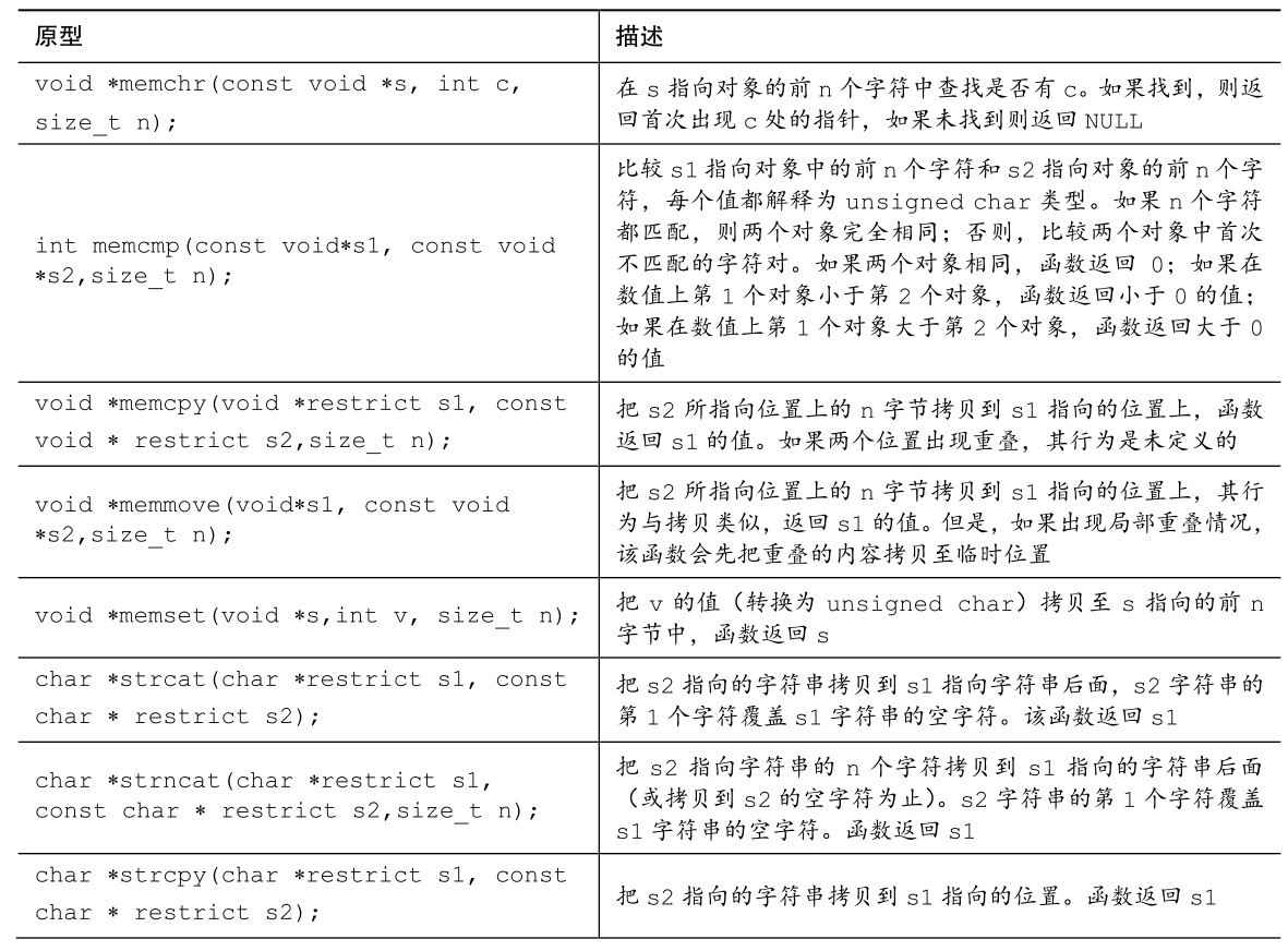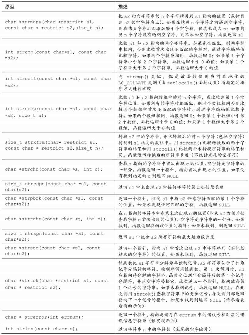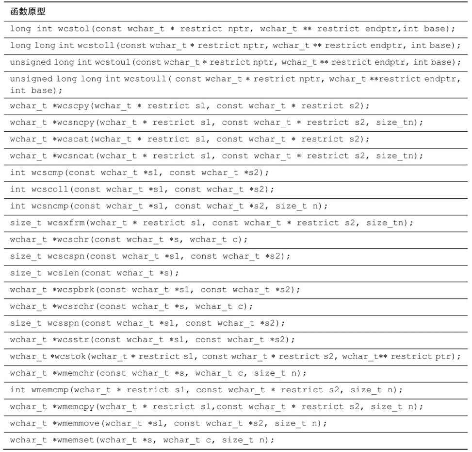 该库中还有与string.h库等价的函数。例如,wcscpy(ws1, ws2)把ws1指定的宽字符串拷贝到ws2指向的宽字符数组中。类似地,wcscmp函数比较宽字符串,等等。