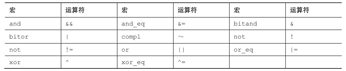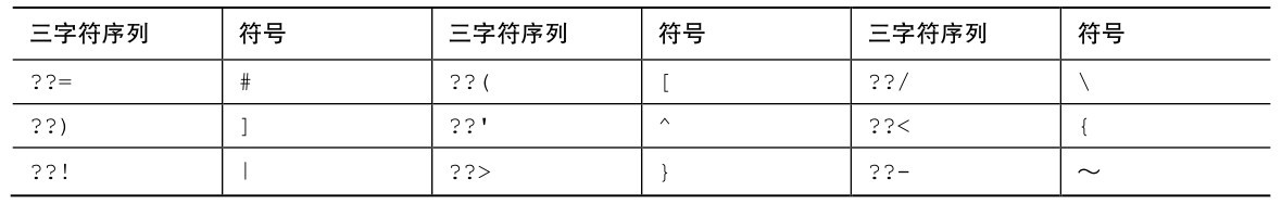 使用三字符序列可以把||运算符写成??!??!,这看上去比较混乱。C99 通过iso646.h头文件(参考资料V中的表B.5.11)提供了可展开为运算符的宏。C标准把这些宏称为可选拼写(alternative spelling)。
