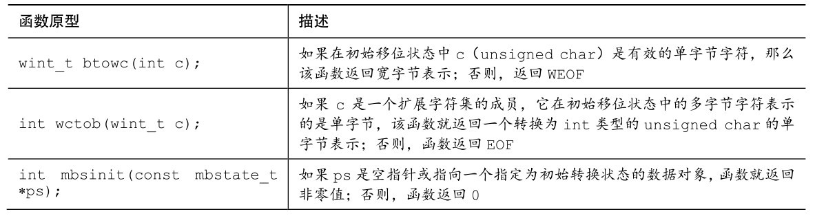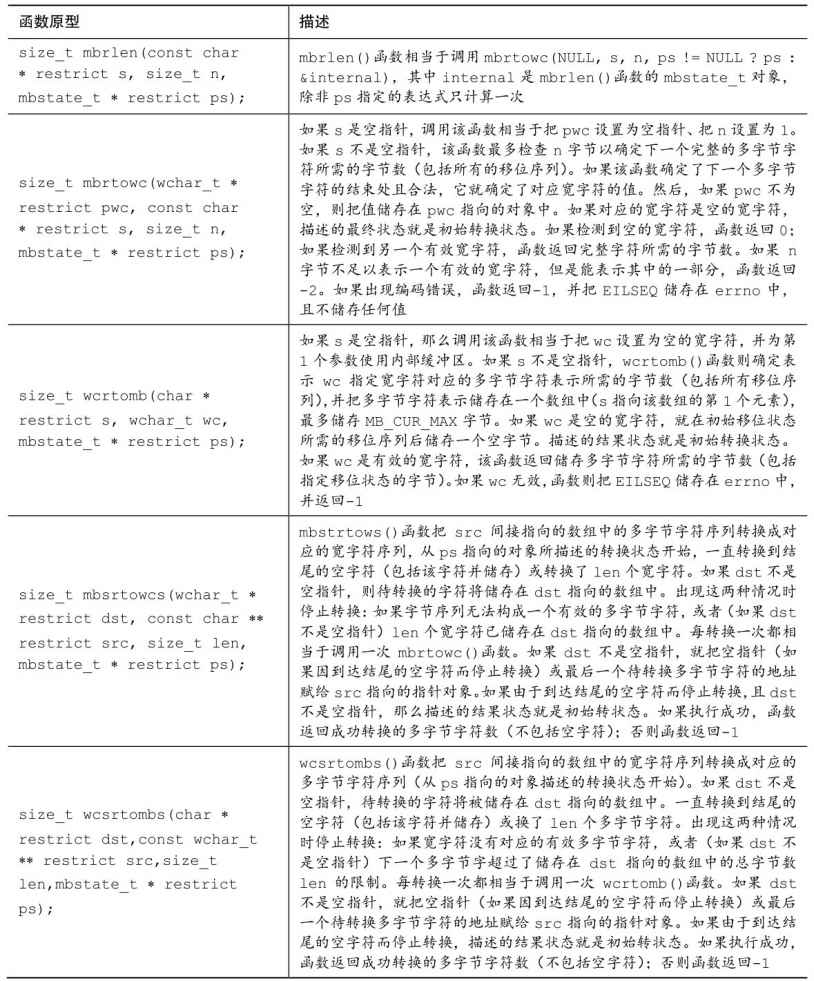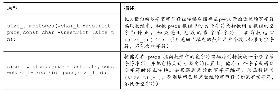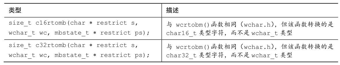 C99 在wchar.h库中提供了一些函数,用于多字节和宽字节之间的转换。mbrtowc函数把多字节字符转换为宽字符,wcrtomb函数把宽字符转换为多字节字符。类似地,mbstrtowcs函数把多字节字符串转换为宽字节字符串,wcstrtombs函数把宽字节字符串转换为多字节字符串。