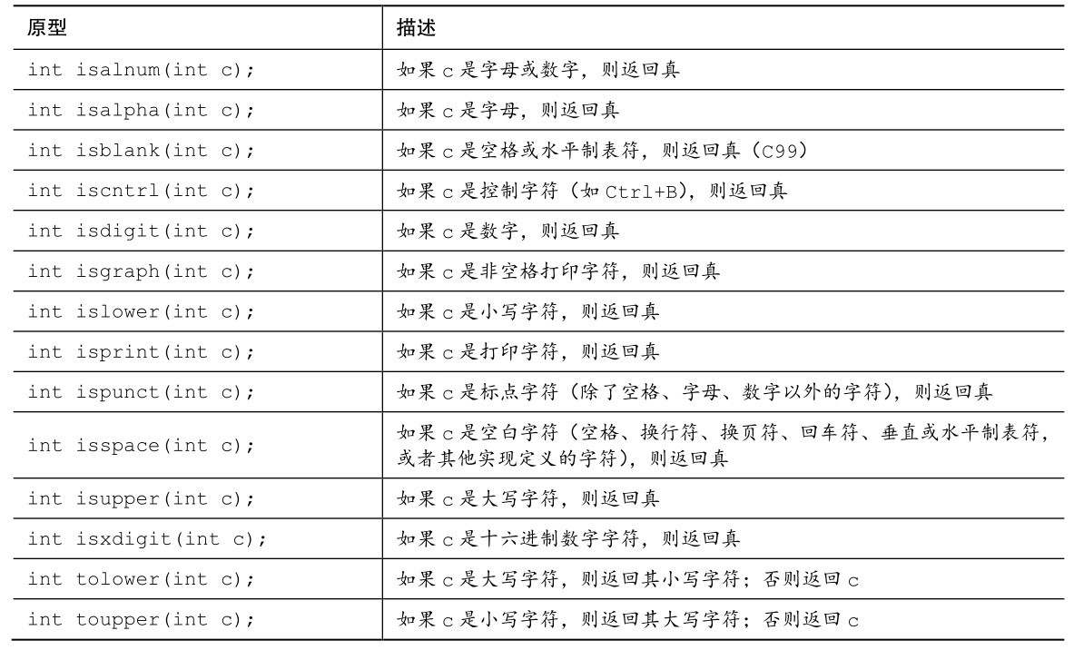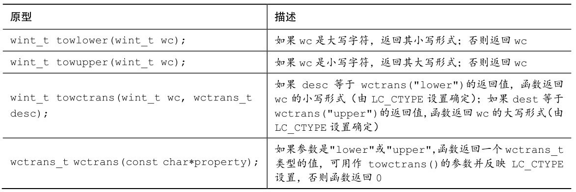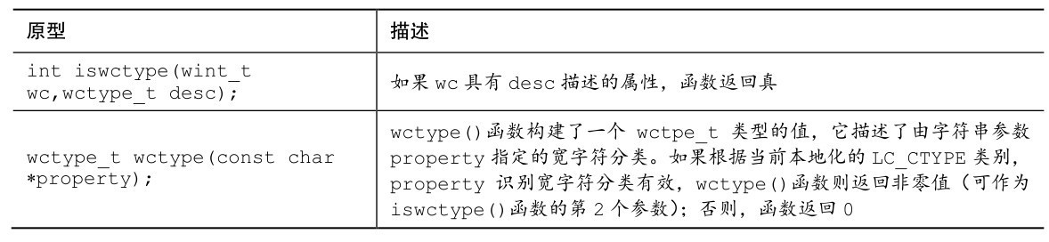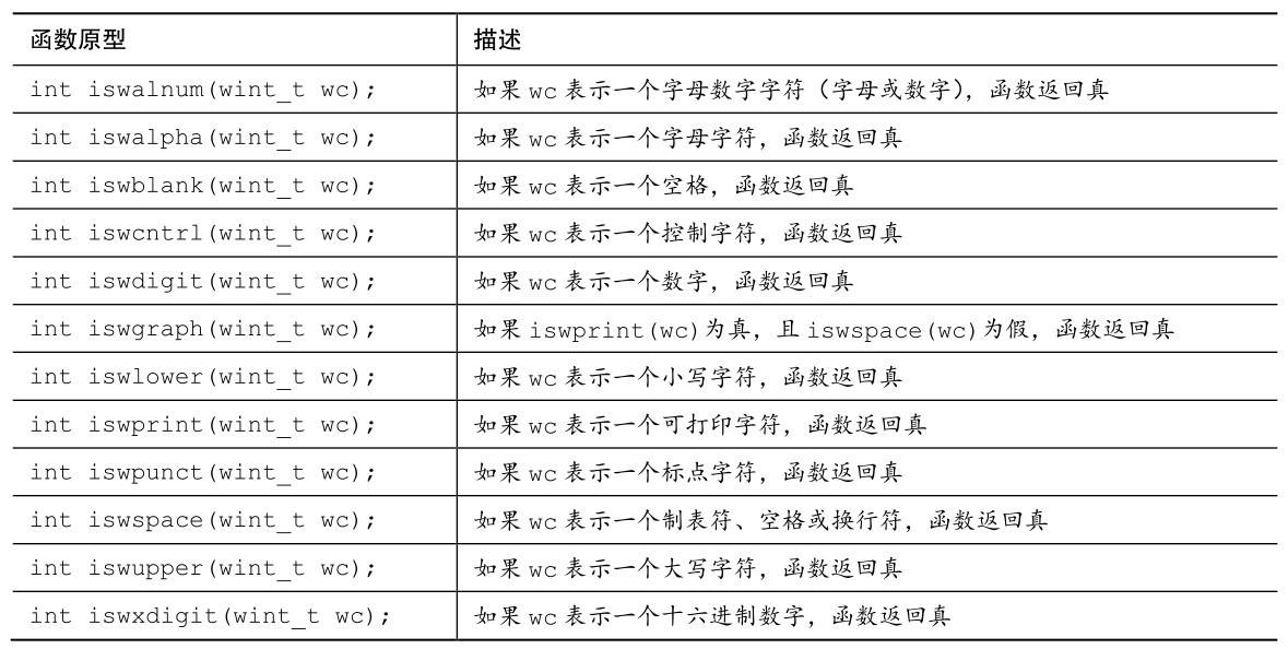 wctype.h头文件新增了字符分类函数,例如,如果iswdigit函数的宽字符参数是数字,则返回真;如果iswblank函数的参数是空白,则返回真。空白的标准值是空格和水平制表符,分别写作L''和L'\t'。