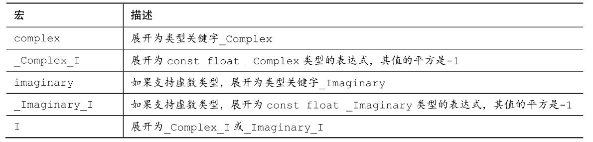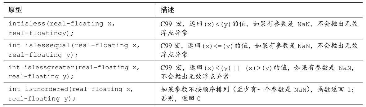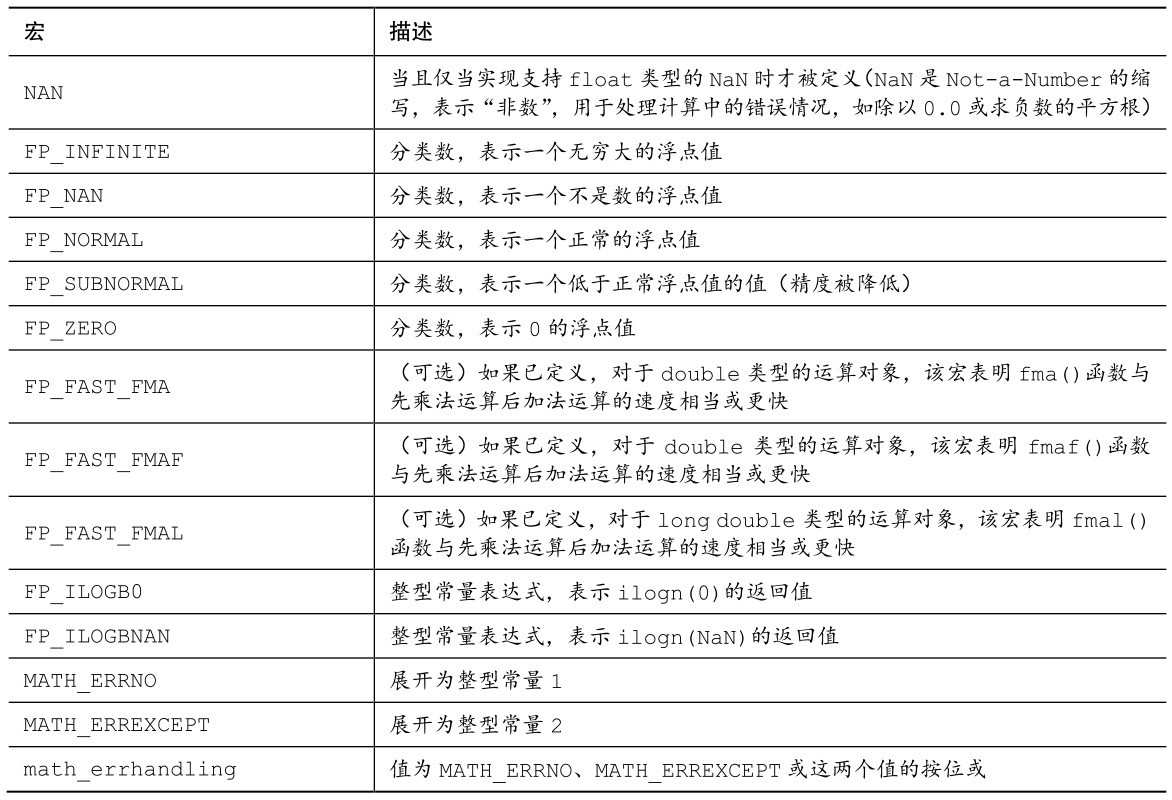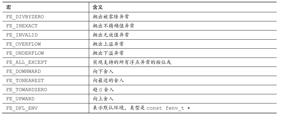 float.h中的宏FLT_HAS_SUBNURM、DBL_HAS_SUBNORM和LDBL_HAS_SUBNORM表征实现如何处理低于正常的值。下面是这些宏可能会用到的值及其含义: