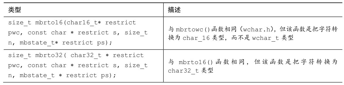 C11在uchar.h库中提供了一些函数,用于多字节和char16_t之间的转换,以及多字节和char32_t之间的转换。