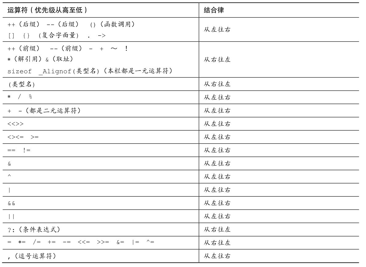 C语言有大量的运算符。表B.2.1按优先级从高至低的顺序列出了C运算符,并给出了其结合性。除非特别指明,否则所有运算符都是二元运算符(需要两个运算对象)。注意,一些二元运算符和一元运算符的表示符号相同,但是其优先级不同。例如,*(乘法运算符)和*(间接运算符)。表后面总结了每个运算符的用法。