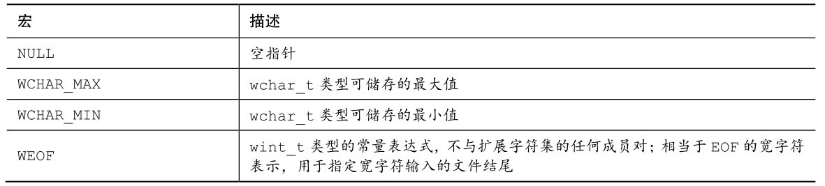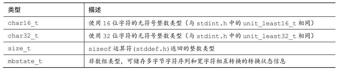 C99为使用宽字符提供更多支持,通过wchar.h和wctype.h库包含了更多大型字符集。这两个头文件把wchar_t定义为一种整型类型,其确切的类型依赖实现。该类型用于储存扩展字符集中的字符,扩展字符集是是基本字符集的超集。根据定义,char类型足够处理基本字符集,而wchar_t类型则需要更多位才能储存更大范围的编码值。例如,char 可能是 8 位字节,wchar_t 可能是 16 位的 unsigned short。
