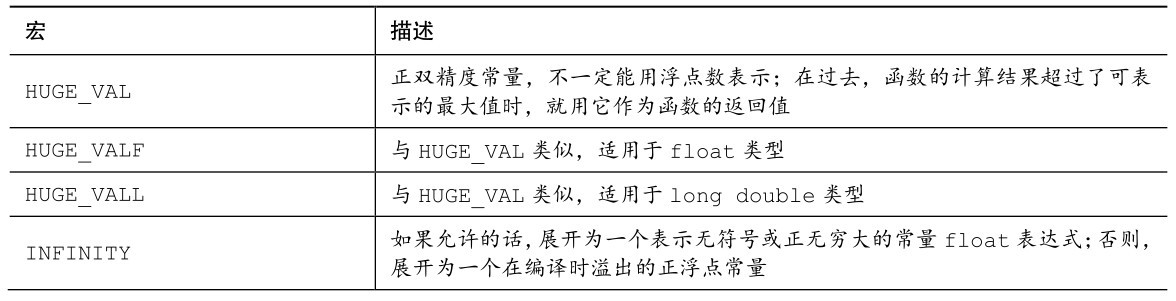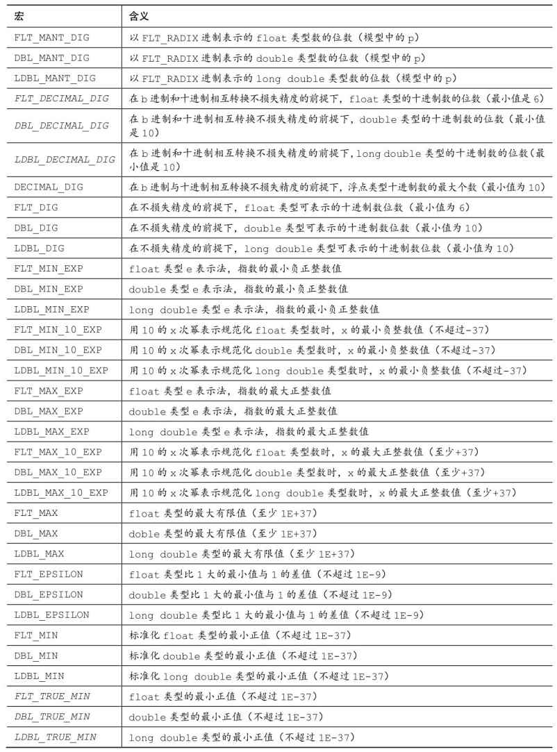 float.h中的许多宏都与该浮点表示相关。例如,对于一个float类型的值,表示基数的FLT_RADIX是b,表示有效数位数(基数为b时)的FLT_MANT_DIG是p。