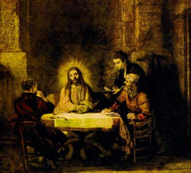 到了以马忤斯地方,他们停下,不相识的同伴仍要继续前进。他们把他留着说:“日暮途远,还是和我们一起留下罢。”他和他们进去了。但当他们同席用膳时,不相识者拿起面包,他祝福了,分给他们。于是他们的眼睛张开来了,他们认出这不相识者便是耶稣,而耶稣却在他们惊惶之际不见了。