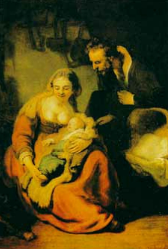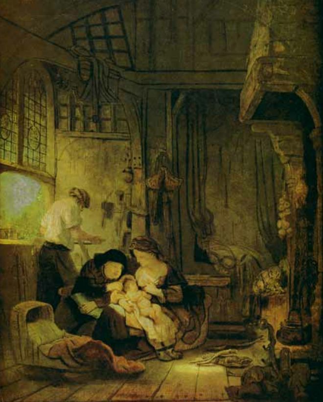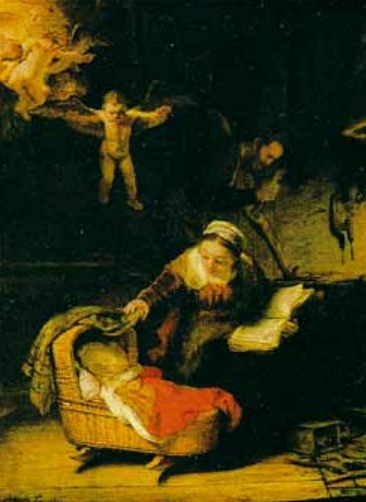 我在此再申引一次英国罗斯金说乔托的话:“乔托从乡间来,故他的精神能发现微贱的事物所隐藏着的价值。他所画的圣母、圣约瑟、耶稣,简直是爸爸、妈妈与宝宝。”是啊,圣家庭是圣约瑟、圣母与耶稣,历史上最大的画家所表现的亦是圣约瑟、圣母与耶稣;而如果我们站在更为人间的观点上,确只是“爸爸、妈妈与宝宝”,乔托所怀的观念当然即是如此,因为他还是一个圣方济各教派的信徒呢。至于伦勃朗的圣家庭,却亦充满着《圣经》的精神:这是拿撒勒(Nazareth)的木匠的居处;这是圣家庭中的平和;这是在家事与工作之间长大的耶稣童年生活;这是耶稣与他的父母们所度的三十年共同生活。