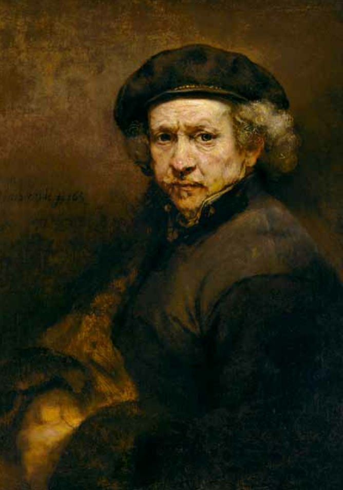 1660年。他的青年夫人萨斯基亚(Saskia)已于1642年去世。无边的幸福只有几年的光阴。此后十六年中,他如苦役一般在悲哀中工作。他穷了,穷得人们把他的房屋和他在爱情生活中所置的古玩一齐拍卖。他有一个儿子,叫做提杜斯(Titus),而伦勃朗续娶了这孩子的保姆。虽然一切都拍卖了,虽然经过了可羞的破产,虽然制作极多,他仍不能偿清他所有的债务。刚刚画完,他的作品已被债主拿走了。他不得不借重利的债,他为了他的妻子与儿子度着工人般的生活。在卢浮宫中的他的第二幅《自画像》,便是在破产以后最痛苦的时节所作的。在此,他不复是我们以前所见的美少年了:在憔悴的面貌上,艰苦的阅历已留下深刻的痕迹。