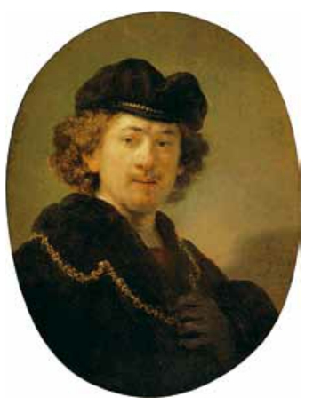然而,幸福并不能造成一个心灵。伦勃朗这一时期的自画像,为数颇不少,都和上述之作大体相同。虽然技术颇为巧妙,但缺少在以后的作品中成为最高性格的这种成分。这时期,光暗还应用得非常谨慎,还不是以后那种强有力的工具:他只用以特别表显有力的线条,勾勒轮廓和标明口与下巴的有规则的典雅的曲线。那时节,伦勃朗心目中的人生是含着微笑的。患难尚未把他的心魂磨折成悲苦惨痛。