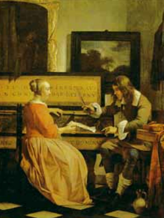 哈布里尔·梅曲:《古钢琴边》,板面油画,1658年,38.4cm×32.2cm