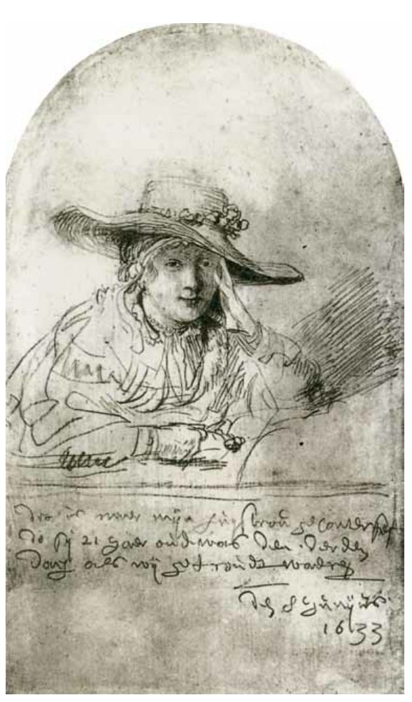 《戴草帽的萨斯基亚》(画家第一任妻子),素描,1633年,18.5cm×10.5cm