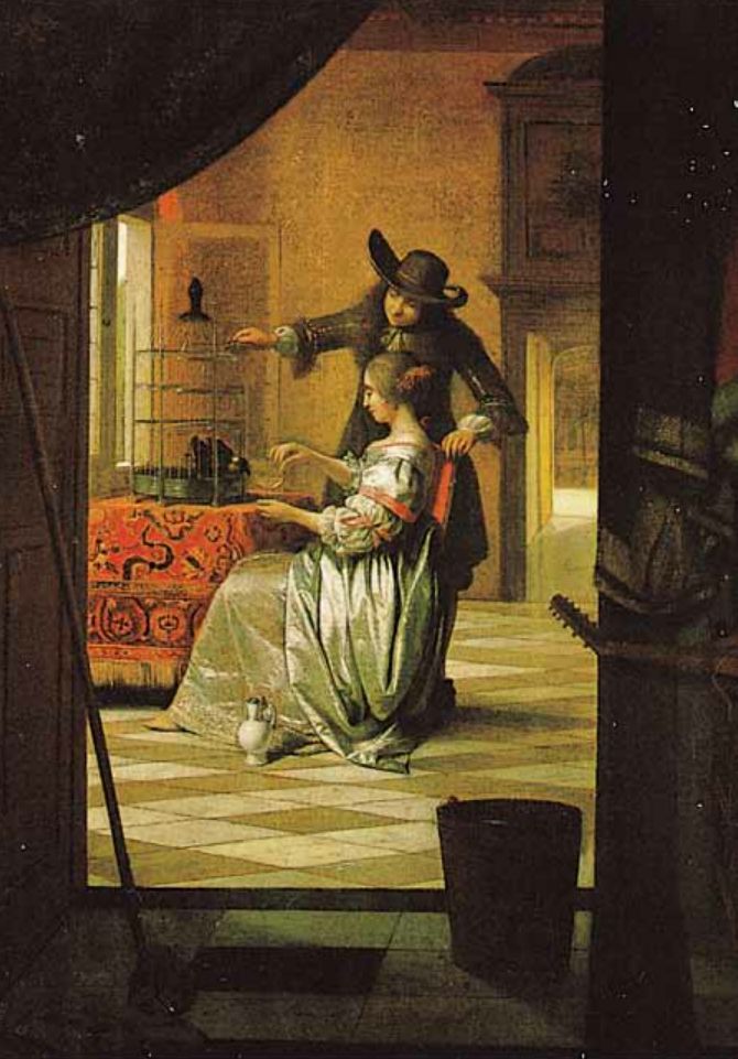 彼得·特·霍赫:《玩鹦鹉的夫妇》,布面油画,73×62cm